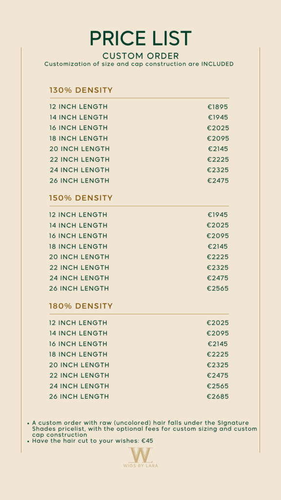 - Indien je een Custom Order bestelt met raw hair (niet aangepast), is dit voordeliger en valt dit onder een andere prijsklasse. Dit komt omdat het haar niet gekleurd hoeft te worden en er dus minder werkuren voor nodig zijn. Neem contact op voor een prijsindicatie.